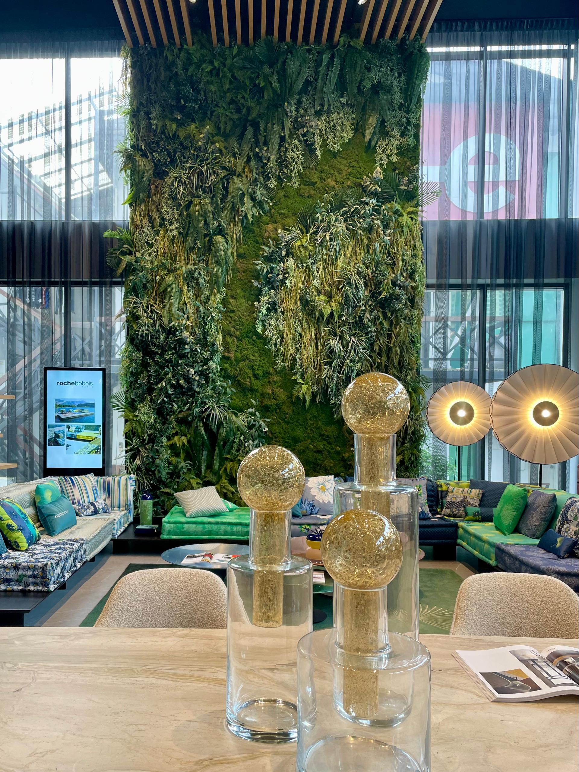 A green grass wall inside the showroom was enhanced with K-array Anakonda speakers, providing subtle yet powerful audio that integrated seamlessly with the design. At the center of the showroom, the Brionvega Radiofonografo served as the vinyl player, sending music through the entire speaker system and combining iconic design with exceptional sound performance.